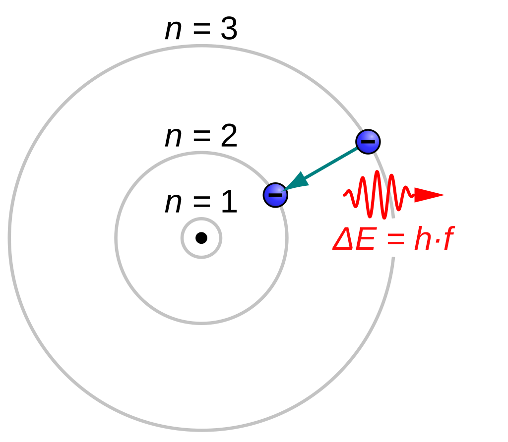 您可以看着这个图片,然后简单地理解为,如果一个电子从外面轨道跳到了里面轨道,那么它就会发光。